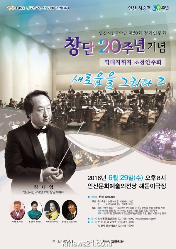 안산시립 국악단(상임지휘자 임상규)은 오는 6월 29일 저녁 8시 안산문화예술의전당 해돋이극장에서 안산시립 국악단 창단 20주년 시리즈의 두 번째 무대인 안산시립 국악단 창단 20주년기념 역대지휘자 초청음악회 ‘새로움을 그리다2’를 개최한다.
