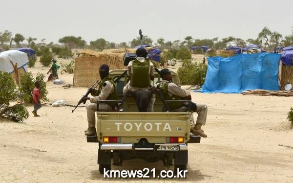 나이지리아 무장 군인이 보코 하람의 공격을 받은 후, 디파(Diffa)에 있는 난민 캠프를 순찰하고 있다.