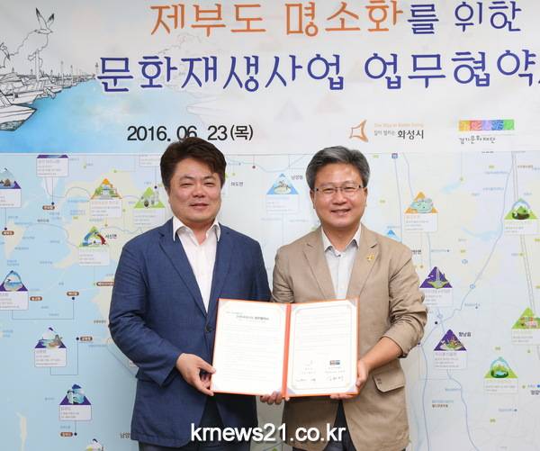 화성시와 경기문화재단은 바다로 길이 열리는 제부도를 문화예술 섬으로 변화시키고자 23일 화성시청 접견실에서 ‘제부도 명소화 문화재생 사업’ 업무협약을 체결했다.