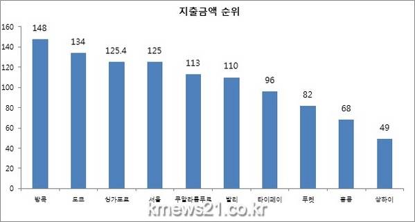 ‘2016 아시아·태평양 관광도시 지수’는 마스터카드 ‘세계 관광도시 지수(Global Destination Cities Index)의 일환으로 올해 처음으로 공개된 분석 자료이며, 아태지역 22개국 167개 관광도시의 해외 방문객 수와 비용 지출 예상액에 대한 전망을 제시하고 있다. 이번 조사 결과, 서울을 방문하는 해외 방문객의 지출금액은 약 125억 달러(한화 약 14조 5천억 원)에 달할 전망이다. 이는 방콕(148억 달러), 도쿄(134억 달러), 싱가포르(125억 4천만 달러)에 이어 아태지역 중 4위 수준이다.