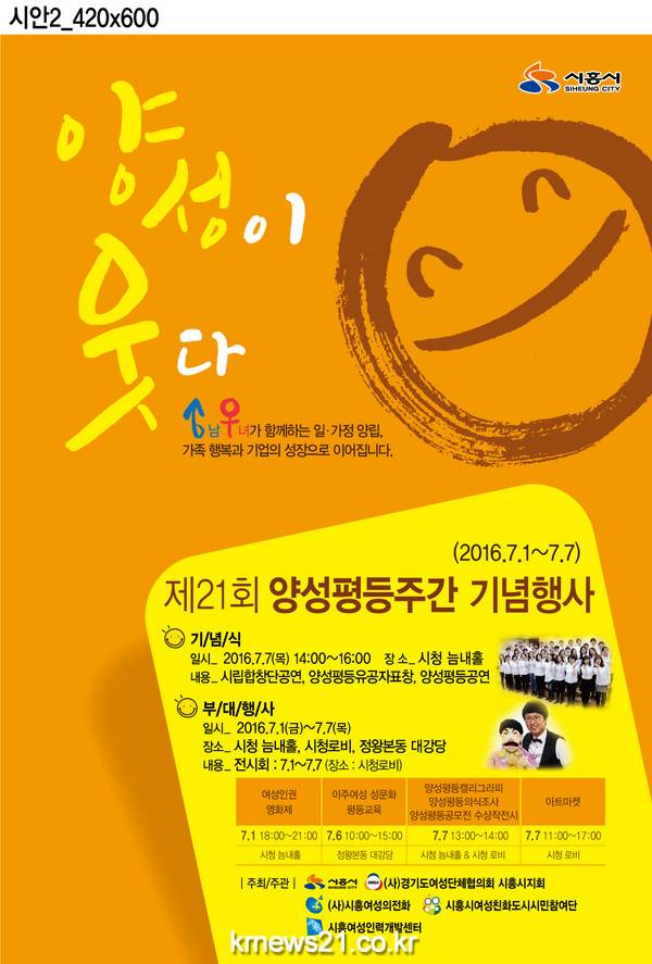 ‘양성이 웃다 - 남녀가 함께하는 일‧가정 양립, 가족 행복과 기업의 성장으로 이어집니다.’라는 슬로건 아래 시흥시에서 준비한 제 21회 양성평등주간 기념행사에 많은 시민들의 관심과 참여를 바란다.