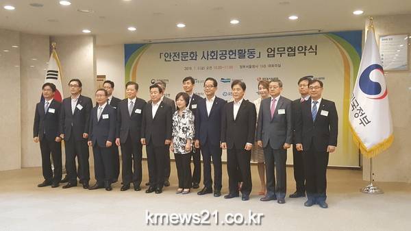 도로교통공단(이사장 신용선)이 8일(금) 정부서울청사에서 국민안전처 주관으로 열린 ‘안전문화 사회공헌활동’ 업무협약식에 참석해 국민안전처와 삼성전자, LG전자, 현대자동차 등 18개 공공기관·민간 기업들과 함께 안전문화 사회공헌활동 협약을 체결했다.