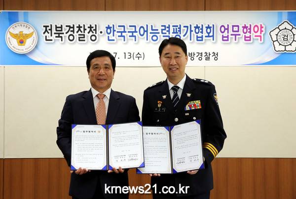 전북지방경찰청(청장 김재원)은 7. 13.(수) 15:00 전북경찰청에서 사)한국국어능력평가협회 이사장 등 관계자가 참석한 가운데, 올바른 국어사용을 위한 업무협약(MOU) 체결식을 개최하였다.