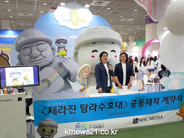 제목은 <제라진 탐라수호대>다. 이번 애니메이션은 한국콘텐츠진흥원과 제주테크노파크의 지역특화문화콘텐츠 개발사업의 일환으로 ‘꼬마하르방 제돌이’ 캐릭터를 만든 (주)시와월드와 ‘어리이야기’의 제작사인 NHC미디어가 공동 제작한다. 이를 위해 두 기업은 13일(수) 서울 코엑스에서 애니메이션 제작을 위한 MOU 체결식을 가졌다.
