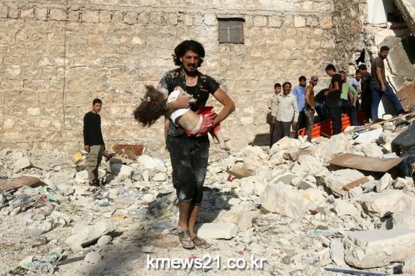 시리아 알레포의 반군 지역인 사쿠르(Sakhur)에 공습이 일어난 후, 건물 잔해에서 아이를 옮기고 있는 한 남성.
