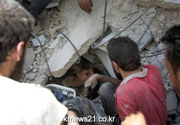 '화이트 헬멧'(The White Helmets)으로 알려진 시리아 민방위 자원봉사자들이 반군 개최 지역인 알레포의 북부 도시 알마슈 하드에서 정부의 공습 후 파괴된 건물 잔해에서 소년을 발견했다.