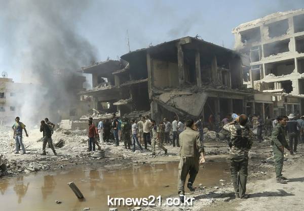 시리아 쿠르드 지역인 북부 도시 카미실에서 27일(현지시간) 폭탄 공격으로 최소 44명이 사망한 현장에 주민들이 모여들고 있다.