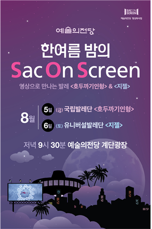 한여름의 열대야가 이어지는 8월, 여름방학과 휴가철을 맞이하여 더위에 지친 시민들을 위하여 ‘한여름 밤의 SOS(SAC ON SCREEN)' 프로그램을 준비했다. 잠 못 이루는 밤, 무더위를 피해 도심 속 피서지가 될 예술의전당 계단광장에서 8월 5일(금), 6일(토) 양일간 저녁 9시 30분 국립발레단 <호두까기인형>과 유니버설발레단 <지젤>을 상영한다.