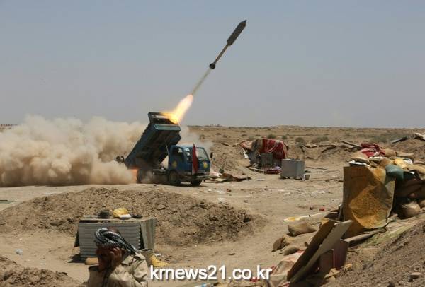 이라크 정부군이 안바르 주에서 IS 격퇴전을 벌이며 주도인 라마디 동부지역으로 로켓을 발사하고 있다.
