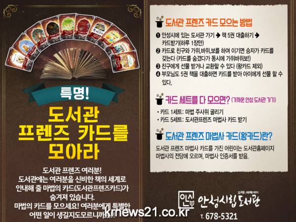 경기도 안성시립도서관에서는 안성시 관내 초등학교 전 학년을 대상으로 『특명! 도서관 프렌즈 카드를 모아라』프로그램을 진행한다고 밝혔다.