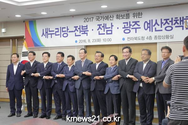 이날 예산정책회의에는 이정현 당대표를 비롯한 정운천 전북도당위원장(예결위원)과 김광림 정책위의장, 김상훈 정책위 수석부위원장, 주광덕 예결위간사, 권석창․성일종 예결위원, 한경노 광주시당위원장, 김중대 전남도당위원장, 송하진 전북도지사, 윤장현 광주시장, 이낙연 전남도지사 등이 참석했습니다.