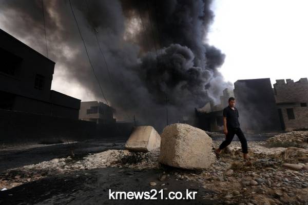 이라크 모술 남부에서 화재로 검은 연기가 피어오르는 유전 지역 근처를 걸어 지나가고 있는 모습.