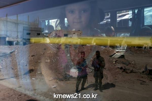 ▲ AFP / Youssef Karwashan[제공자ⓒ 뉴스21통신. 무단전재-재배포 금지.]시리아 수도 다마스쿠스 외각지역의 다라야 마을에서 피난민이 타고 있는 버스 창문을 통해 보이는 시리아 정부군의 모습.