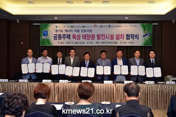 안산시(시장 제종길)는 경기도 및 관내 6개 아파트(푸르지오2차, 푸르지오6차, 선경, 단원금강, 휴먼빌, 아이파크), 시공사((주) 이든스토리)와 함께 9월 1일 ‘공동주택 옥상 태양광 설치’ 공동추진을 위한 양해각서(MOU)를 체결했다.