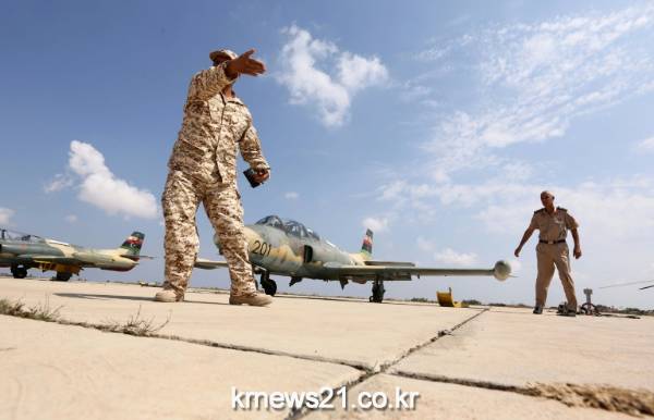 비행 활주로 도로에 있는 전투기 옆에 서 있는 리비아 공군. 시르테에서 IS를 격퇴하기 위해 공군학교를 공군 기지로 바꿨다.