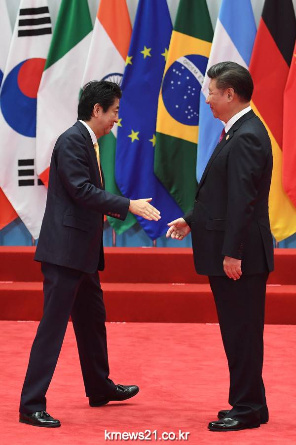▲ 아베 신조 일본 총리와 시진핑 중국 국가주석이 4일 중국 항저우에서 열린 G20 정상회담에서 만나 악수를 나누고 있다. GREG BAKER / AFP[제공자ⓒ 뉴스21통신. 무단전재-재배포 금지.]G20 항저우 정상회담 기간인 5일 아베 총리와 시진핑 중국 국가주석의 정상회담이 이루어졌다.