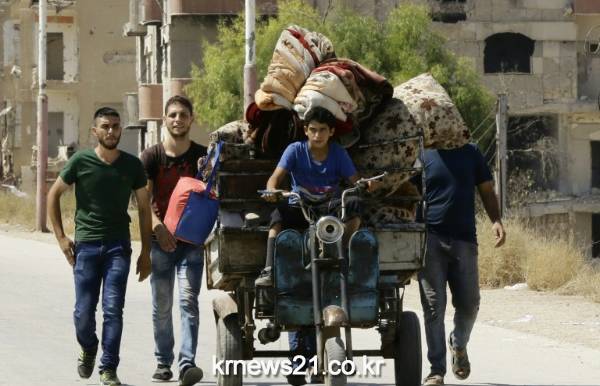 시리아 다라야에서 온 민간인들이 반군지역에서 대피하고 있다.