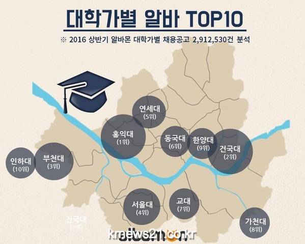 알바몬 조사결과 올 상반기 동안 대학가 중 가장 많은 채용공고를 보유한 대학은 △홍익대로 53,955건의 알바공고가 등록되었으며, 근소한 차이로 △건국대가 53,695건으로 2위를 차지했다. 다음으로 3위 △부천대(30,847건), 4위 △서울대(28,069건), 5위 △연세대(26,086건)가 올랐다.