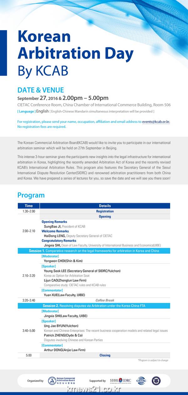 ▲ 대한상사중재원 베이징 세미나 플라이어 (사진제공: 대한상사중재원)대한상사중재원(원장 지성배)이 중국 베이징에서 26일~27일 이틀간 국재중재 설명회를 개최한다. 이번 설명회는 서울을 국제중재 중심지로 만들고 국제중재사건을 유치하기 위한 전략의 일환이다.