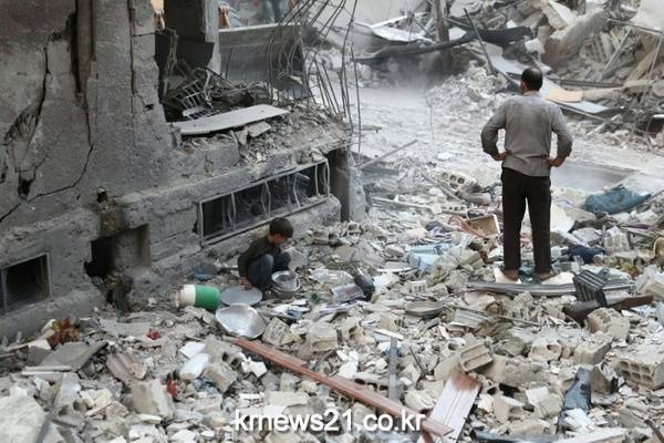 ▲ AFP / Abd Doumany[제공자ⓒ 뉴스21통신. 무단전재-재배포 금지.]시리아 도우마(Douma)에서 정부군의 공습 후 무너진 건물 잔해에서 무언가를 챙기고 있는 소년.