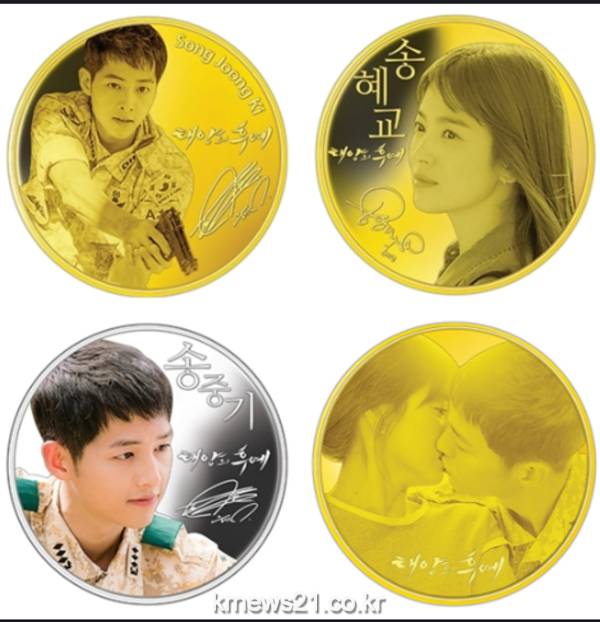 한국조폐공사(사장 김화동)가 솔잎엔터테인먼트(대표 서정희)와 함께 11월부터 한류 열풍을 몰고온 드라마 ‘태양의 후예’의 주역인 일명 ‘송송커플’ 공식기념메달을 출시한다.