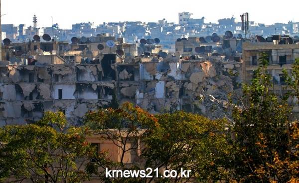시리아 알레포의 부스탄 알 바샤 지구에 정부군의 공습으로 파괴된 건물.
