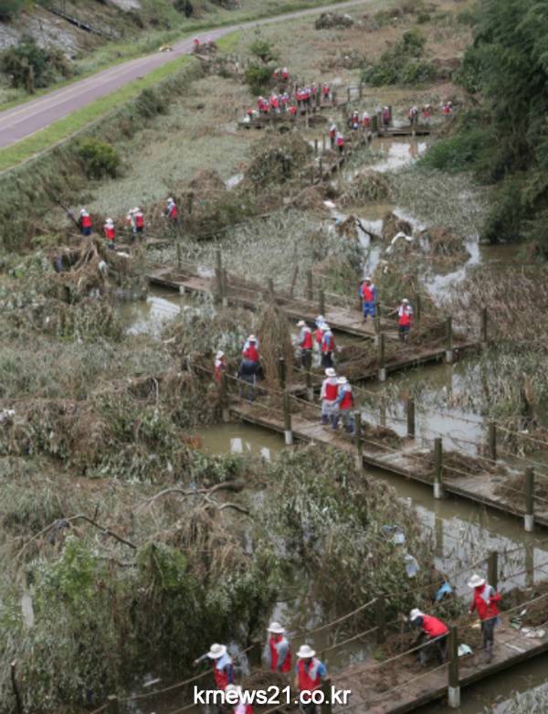 봉사자들은 공원 주변에 쓰러져 있는 나무와 토사물 등 잔해를 치우고 산책로 복구와 쓰레기 수거 등으로 구슬땀을 흘렸다.