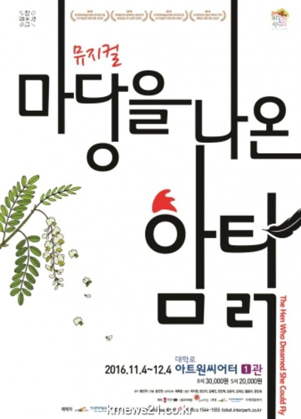 2016년 초 국악이 가미된 가족음악극으로 좋은 반응을 얻었던 극단민들레의 ‘마당을 나온 암탉’이 11월 4일부터 12월 4일까지 대학로 아트원씨어터 1관 에서 새로운 옷을 입고 공연된다.