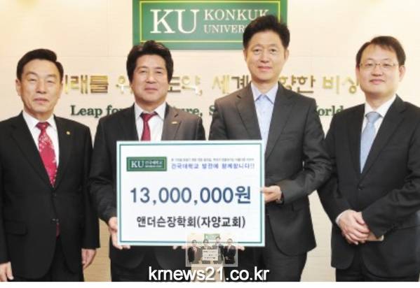 건국대학교 인근 서울 광진구 자양교회 앤더슨장학회가 11일 가정 형편이 어려운 학생들을 위해 건국대에 장학기금 1,300만원을 기부했다.