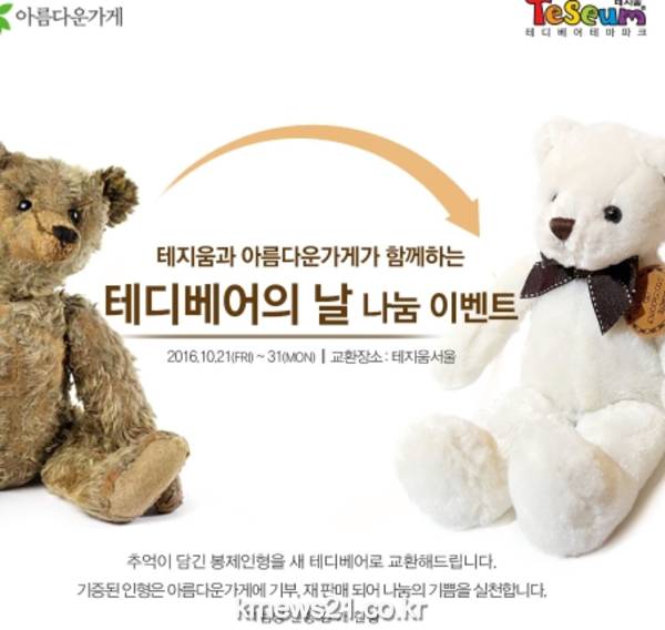 테디베어 테마파크 테지움(전략기획팀장 임인애)이 10월 27일 테디베어의 날을 맞이하여 재사용의 아름다운 나눔을 실천하는 비영리 공익재단 ‘아름다운가게’와 제휴하여 특별이벤트를 기획했다고 12일 밝혔다.