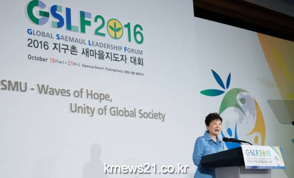 박근혜 대통령은 18일 강원도 평창 알펜시아에서 개최되는 2016 지구촌새마을지도자대회 개막식에 참석해 세계 48개국에서 참석한 700여명의 새마을지도자들을 격려하고 지구촌 빈곤퇴치와 지속가능한 발전을 위한 새마을운동의 기여와 확산을 당부한다.