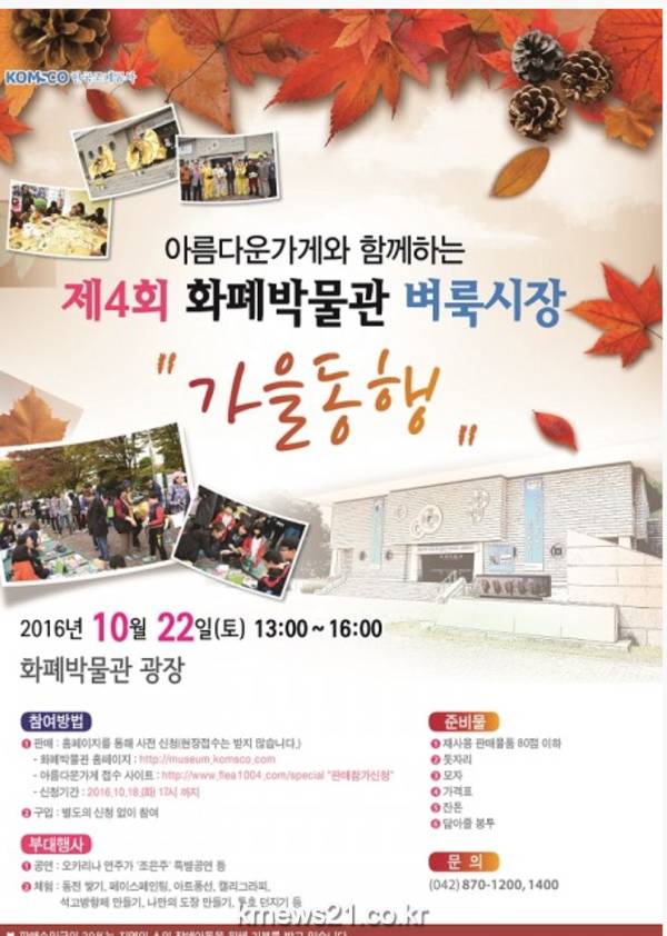 한국조폐공사(사장 김화동)는 공기업으로서의 사회적 책임 완수 및 찾고 싶은 화폐박물관 조성을 위하여 22일(토) 오후 1시부터 4시까지 화폐박물관 광장에서 제4회 화폐박물관 벼룩시장 가을동행을 개최한다.