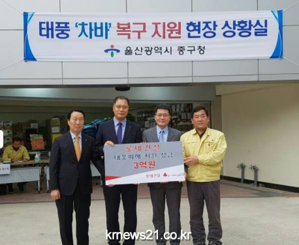 롯데건설이 태풍 ‘차바’로 피해를 입은 울산 중구 주민을 돕고자 3억원을 울산 중구청에 전달했다고 밝혔다.