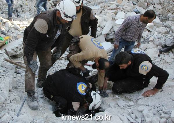시리아 동부 다마스쿠스의 교외에서 포격에 사망한 자를 찾고 있는 시리아 민방위 '화이트 헬멧'과 이들 옆에서 고개를 돌려 울고 있는 피해자의 아들.