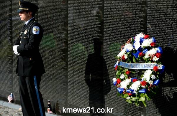 미국 공원 경찰관이 재향 군인의 날 기념 행사 기간 동안 베트남 재향 군인 기념 벽 앞에서 있다.
