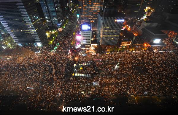 지난 12일 서울 광화문에서 최순실 국정농단 사태와 관련해 박근혜 퇴진을 요구하고 나선 사람들이 촛불로 도로를 밝히고 있다. 이날 시위에는 100만명 (경찰 추정 26만)이 참여해 87년 6월 항쟁 이후 사상 최대 규모이다.