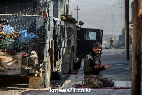 ▲ AFP / Odd Andersen[제공자ⓒ 뉴스21통신. 무단전재-재배포 금지.]이라크 특수부대 소속인 한 군인이 모술의 카르클락 지역 근처에서 도시 탈환 작전이 시작하기 전 군사 차량 옆에서 기도하고 있다.