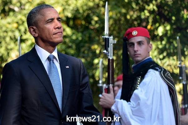 그리스를 방문한 버락 오바마 미국 대통령이 15일(현지시간) 아테네 대통령 궁에 도착해 그의 환영식 행사를 위해 서 있는 경비 앞을 지나가고 있다.