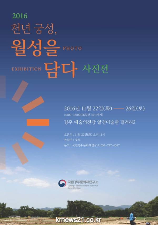 문화재청 국립경주문화재연구소(소장 심영섭)는 오는 22일부터 26일까지 경북 경주시에 있는 경주 예술의전당(알천미술관 갤러리2)에서 <2016 천년 궁성, 월성을 담다> 사진전시회를 개최한다.