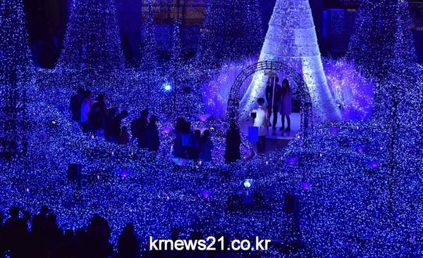 일본 도쿄에서 도쿄 시민들이 캐논 다쥐르의 푸른빛에 감탄하고 있다.