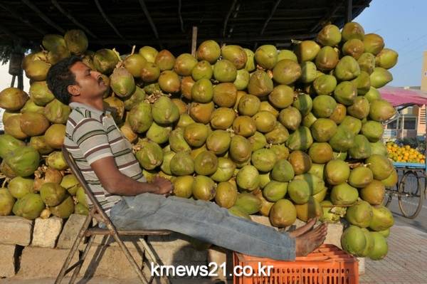 인도의 하이데라바드 외곽에서 코코넛 판매원이 손님을 기다리며 휴식을 하고 있다.