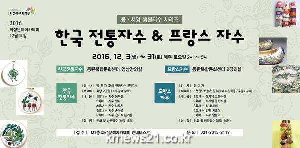 한국여인의 소박함과 개성을 표현하는 전통자수와 다양한 스티치 기법으로 세련미를 표현할 수 있는 프랑스자수 특강은 12월 3일부터 31일까지 총 5회, 매주 토요일 2시부터 운영된다. 재료비는 회당 1인 2만원(한국 전통자수), 5천원~1만5천원(프랑스자수)이며 수업 결과물은 모두 개인이 가져갈 수 있다. 수강신청은 사전예약(방문 또는 전화)을 통해 할 수 있다.