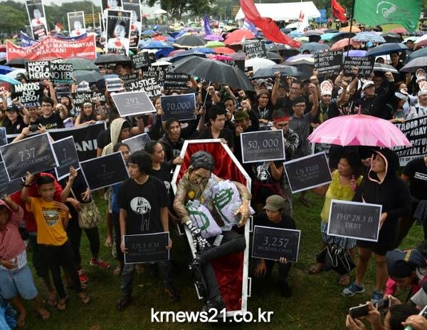 필리핀 마닐라에서 독재자 페르디난드 마르코스 전 필리핀 대통령의 국립 영웅묘지 안장에 반발하는 '검은 금요일' 시위에 참가한 시민들.
