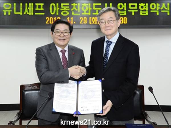 광진구(구청장 김기동)가 유니세프한국위원회와 함께 29일 오후 4시 30분 구청 기획상황실에서 아동친화도시 조성을 위한 업무협약을 맺었다.