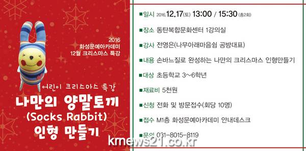 화성시 문화재단(대표이사 권영후) 화성문예아카데미에서는 12월 성탄절 기념으로 어린이 대상 크리스마스 특강 〈나만의 양말토끼(Socks Rabbit) 인형 만들기〉를 운영한다.