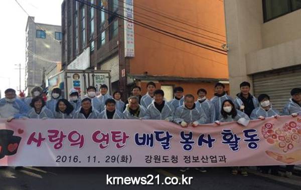 □ 강원도청 정보산업과(과장 변성균)에서는 2016. 11. 29(화) 춘천 연탄은행에 연탄 2,000장을 후원하고, 직원 31명이 참여하여 요선동 거주 3세대에 연탄 600장, 쌀(10㎏ 3포), 라면(3박스) 등을 전달하는 연탄나눔 봉사활동을 실시하였다.