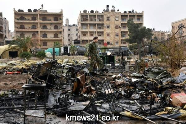 한 러시아 군인이 알레포 정부 관할 구역인 푸르칸 지역에서 반군 포격에 의해 파괴된 것으로 보도된 병원의 현장 피해를 조사하고 있는 모습.
