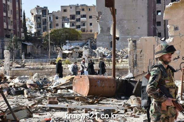 ▲ AFP / GEORGE OURFALIAN[제공자ⓒ 뉴스21통신. 무단전재-재배포 금지.] 시리아 반군 지역이던 알레포의 마사켄 하나노 지역을 장악한 시리아 정부군.