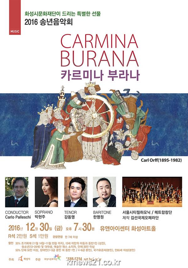 12월 30일 화성아트홀에서 공연되는 ‘카르미나 부라나’는 환희와 갈망, 방황과 절망, 사랑 등의 인생의 희로애락을 음악 속에 모두 담은 작품이다. 독일의 작곡가이자 지휘자인 칼 오르프(Carl Orff)의 작품으로 영국과 유럽, 미국, 호주에서 활발하게 활동 중인 음악 비평가와 학자들이 ‘죽기 전에 꼭 들어야 할 클래식 음악’으로 선정하기도 한 대작이다. 이번 공연은 서울시티 필하모닉오케스트라와 매트오페라단이 함께하며 예술 감독 김선, 지휘 카를로 팔레스키, 소프라노 박현주, 바리톤 한명원, 테너 강동명, 피아노 서미경 등이 참여한다. 공연은 12월 30일 금요일 오후 7시 30분에 화성아트홀에서 진행되며, 티켓 가격은 R석 2만원, S석 1만원이며 단체관람 시 20인 이상 30%, 50인 이상 50%할인을 적용받을 수 있다.