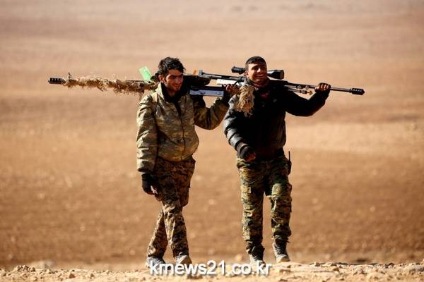 ▲ AFP / DELIL SOULEIMAN[제공자ⓒ 뉴스21통신. 무단전재-재배포 금지.]시리아 민주당으로 알려진 쿠르드족 아랍 동맹군의 저격수들이 시리아 락까의 서쪽 외각의 알 헤이마르 지역에 있는 모습.